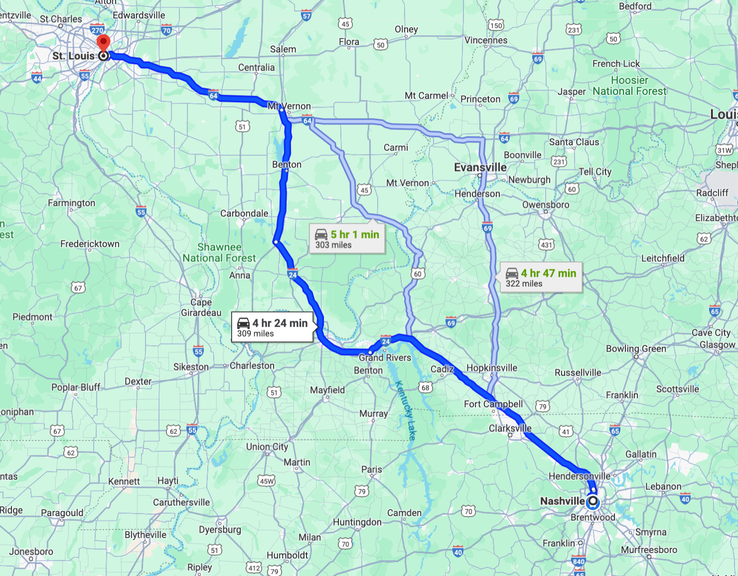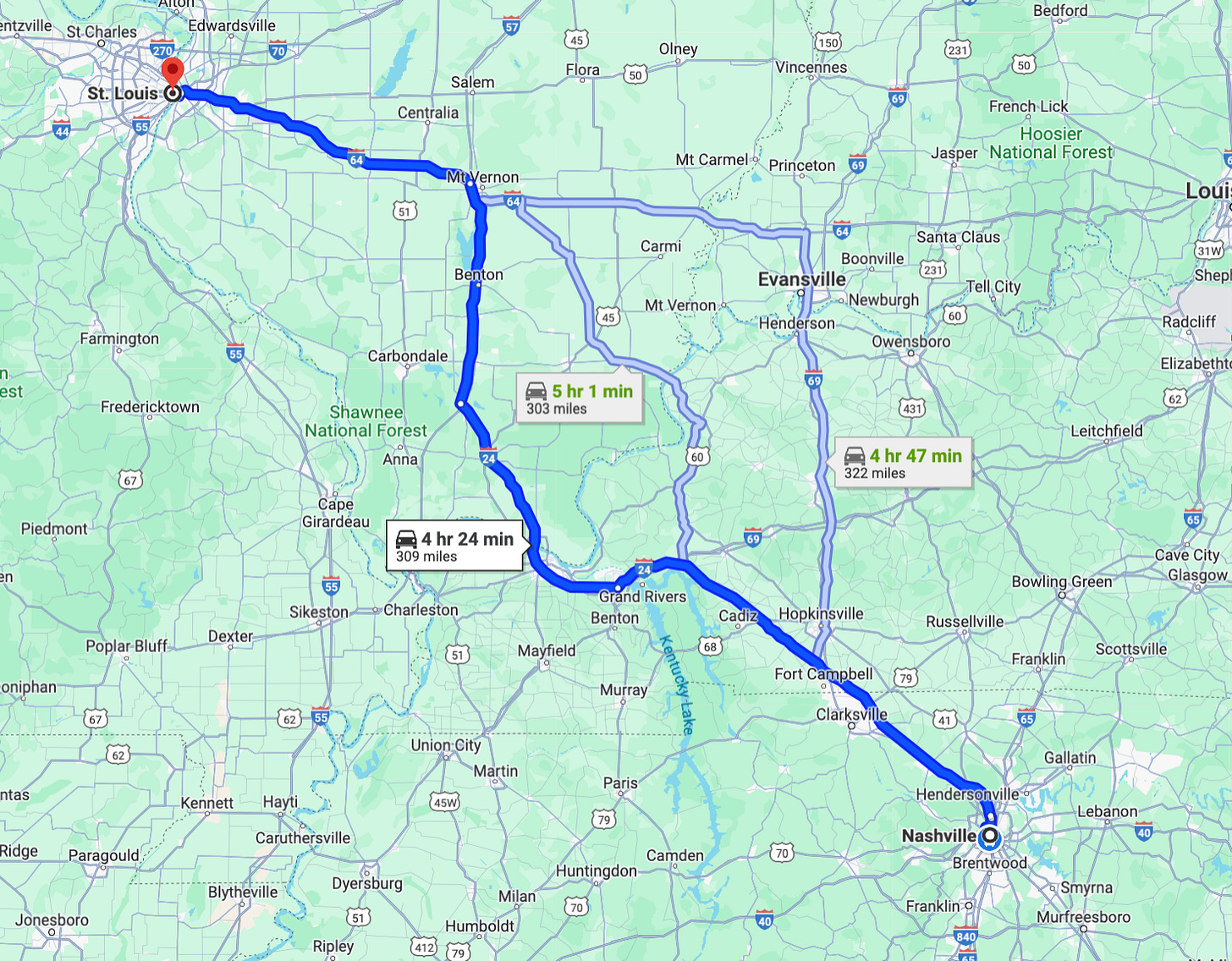This was a three-state day. We crossed the State Line from Tennessee into Illinois and onto St. Louis, Missouri. Once the home of Tina Turner, the KKK and alcohol prohibitionist Christians.