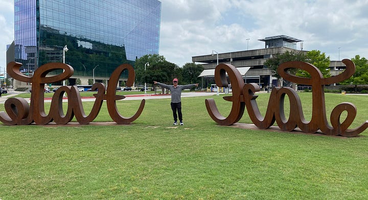 Day 9 is a day in Austin. Austin is in the news today as University students and School children march in protest against Biden’s gaslit Nazi Genocide. Seeing this splendid sculpture of Love and Hate representing the two choices we most commonly face in life it occurred to me that; it’s always your choice. We are free to choose. But there is no way genocide, mass starvation-murder of millions of children, is ever the Love choice.